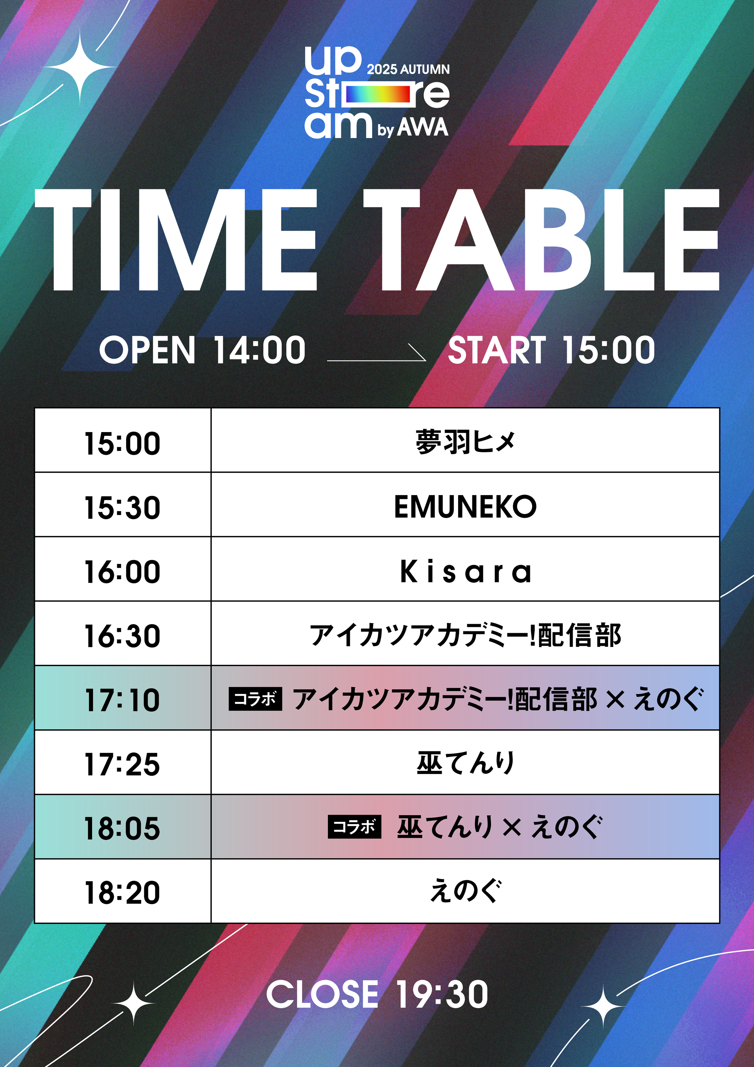 2025年11月30日(日)に池袋のW:IKE329でえのぐをキュレーターにむかえ4回目となるリアルライブ『AWA UPSTREAM 2025 AUTUMN』を開催。当日のタイムテーブルや来場特典、会場限定で販売されるオリジナルグッズなどを本日公開いたしました。