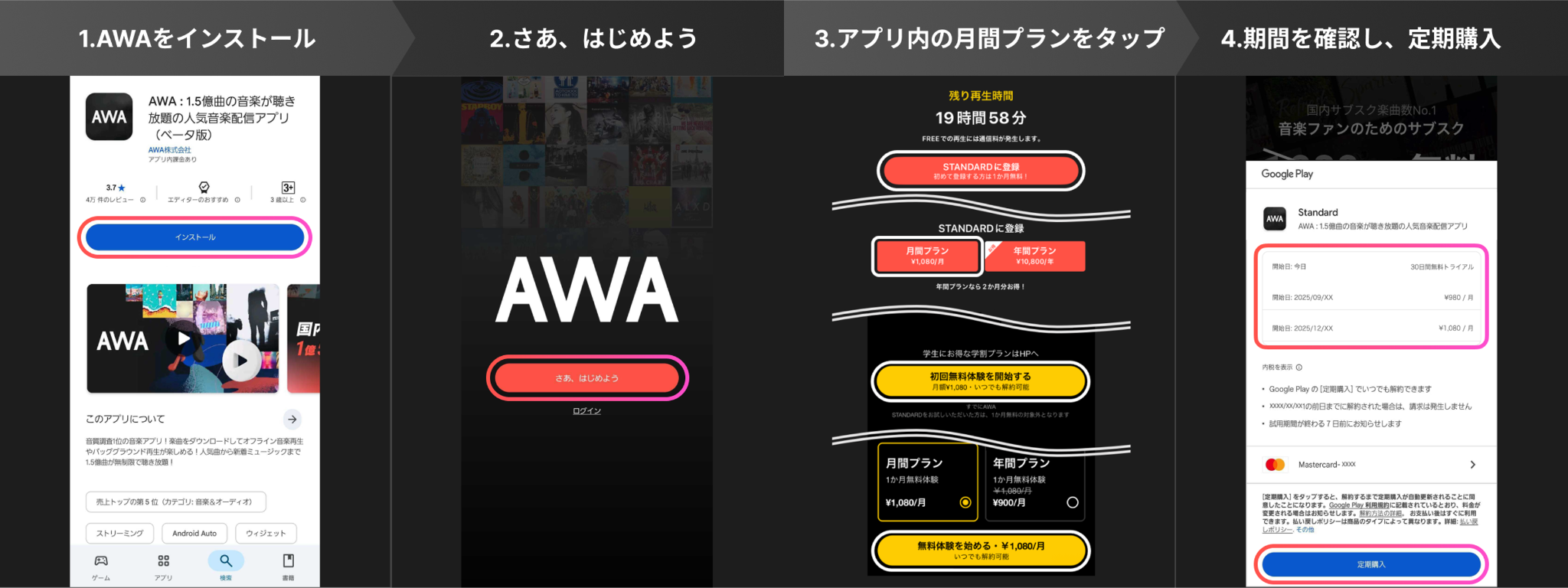 ②記載の応募手順に沿って、AWA STANDARD月間プランをGoogle Play Storeで決済された方。