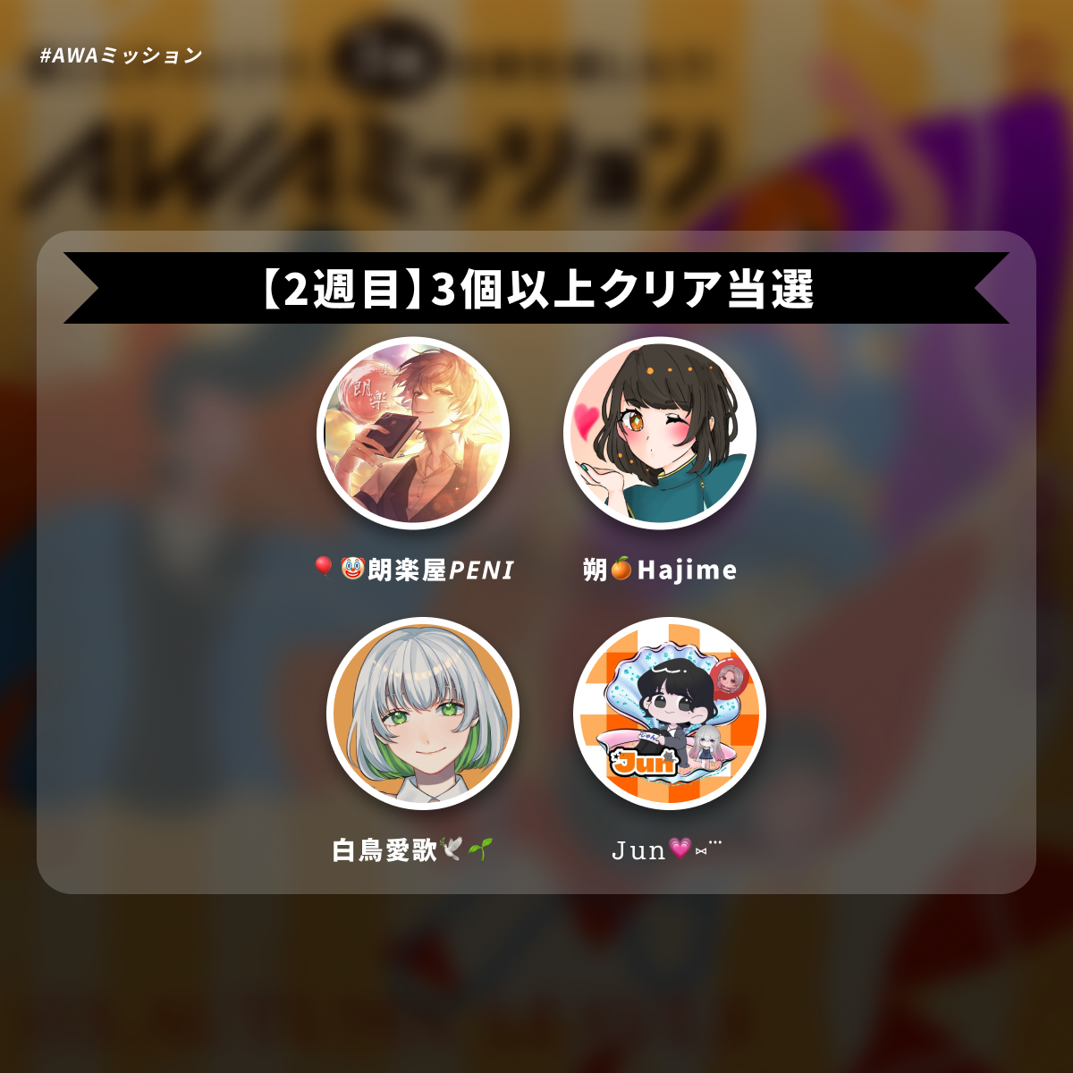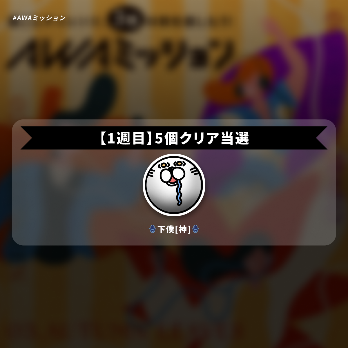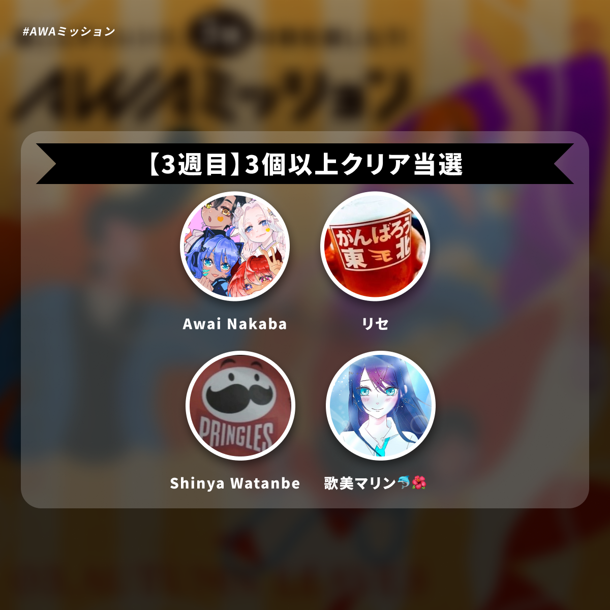 awa October 3, 2025 Android, iOS, PC 10月の「AWAミッション」当選者発表! awa Android, iOS, PC 2025.10.03 10/19(日)~11/8(土)の3週間にわたって開催した「AWAミッション」Amazonギフトカードの当選者は下記の結果となりました! パーフェクト賞 1週目 2週目 3週目 当選者の方へは、追ってアプリ内にてお知らせをお送りいたします。たくさんのご参加ありがとうございました! ▼11月もAWAミッション開催! 今後も注目のイベントが目白押し!各イベントの詳細はこちらからチェック↓
