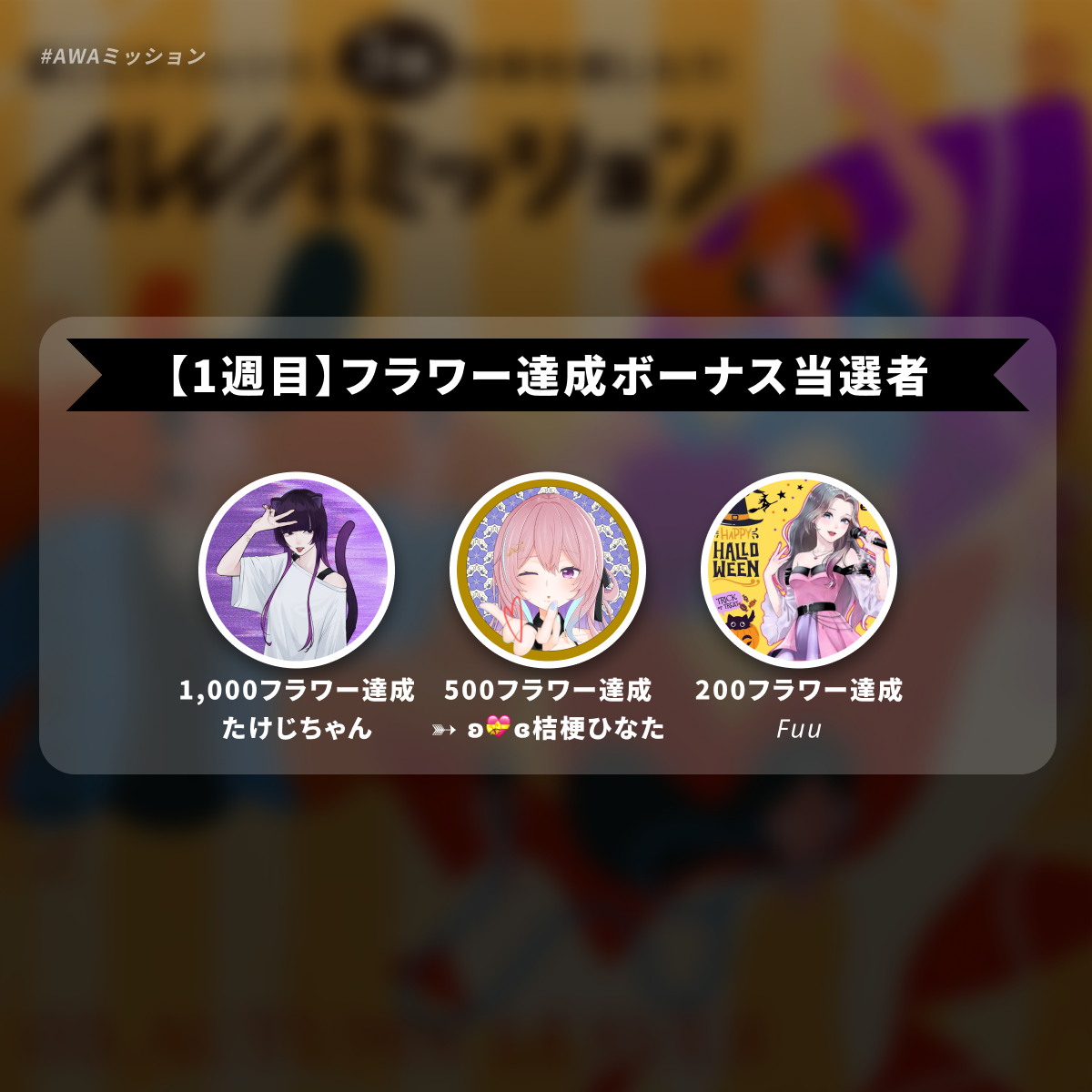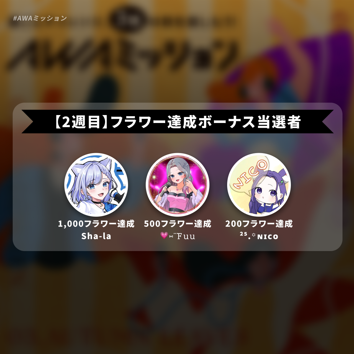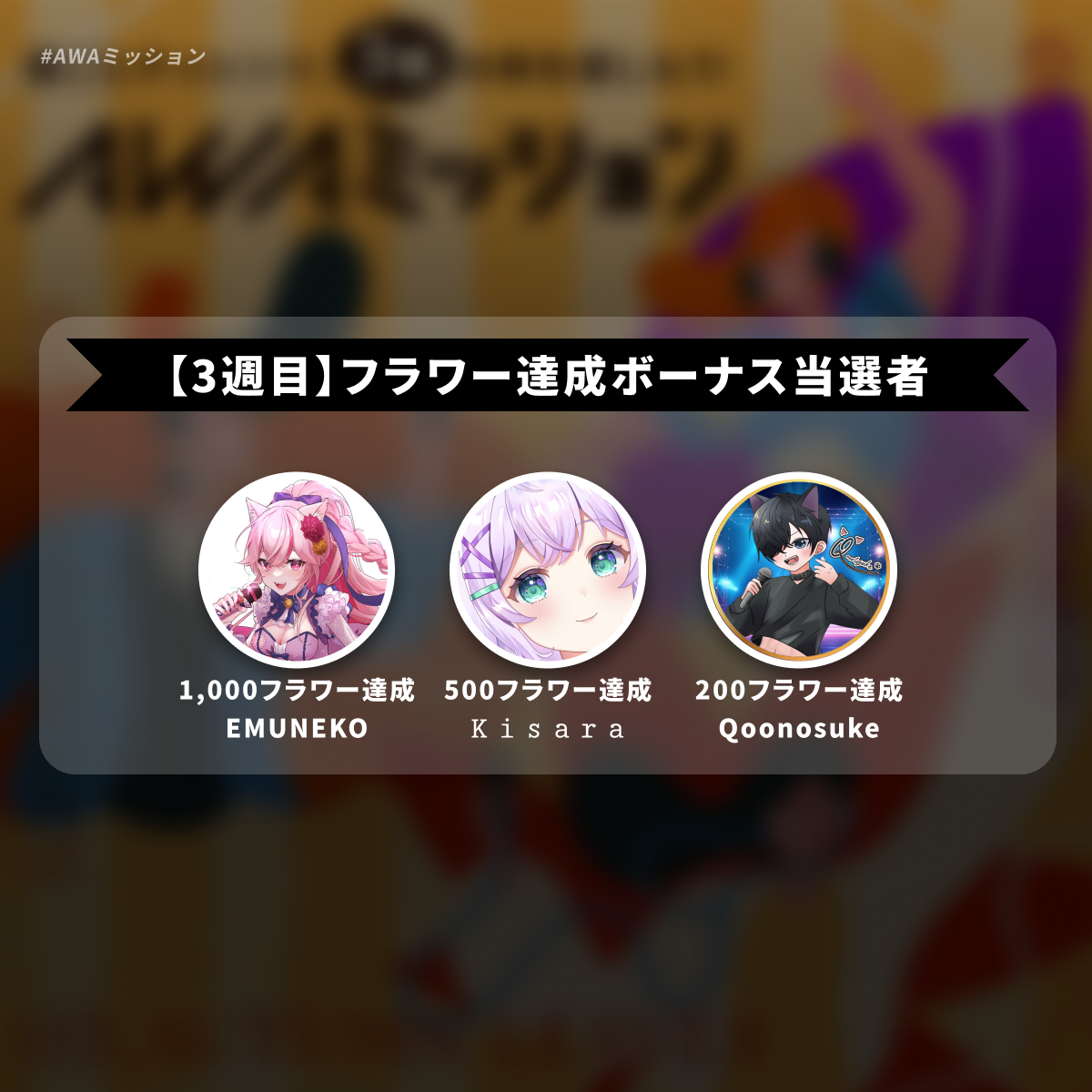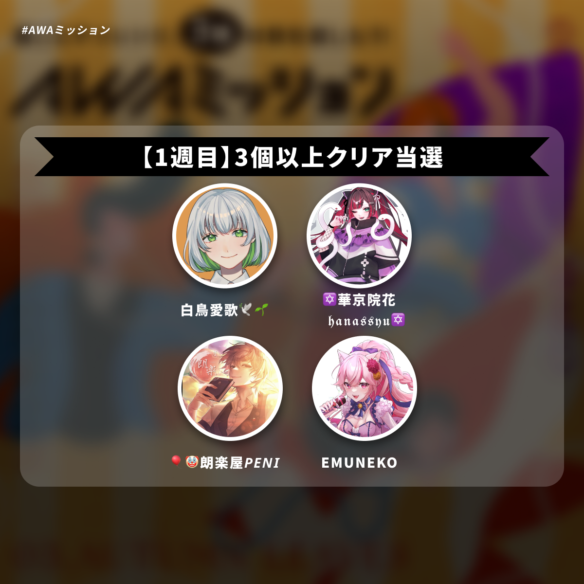 awa October 3, 2025 Android, iOS, PC 10月の「AWAミッション」当選者発表! awa Android, iOS, PC 2025.10.03 10/19(日)~11/8(土)の3週間にわたって開催した「AWAミッション」Amazonギフトカードの当選者は下記の結果となりました! パーフェクト賞 1週目 2週目 3週目 当選者の方へは、追ってアプリ内にてお知らせをお送りいたします。たくさんのご参加ありがとうございました! ▼11月もAWAミッション開催! 今後も注目のイベントが目白押し!各イベントの詳細はこちらからチェック↓