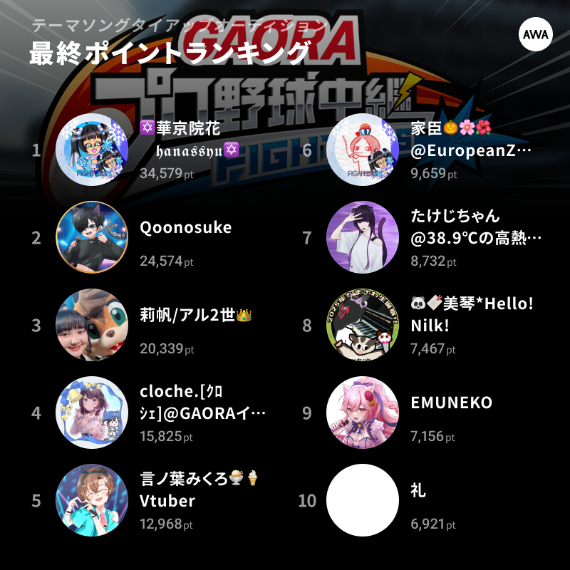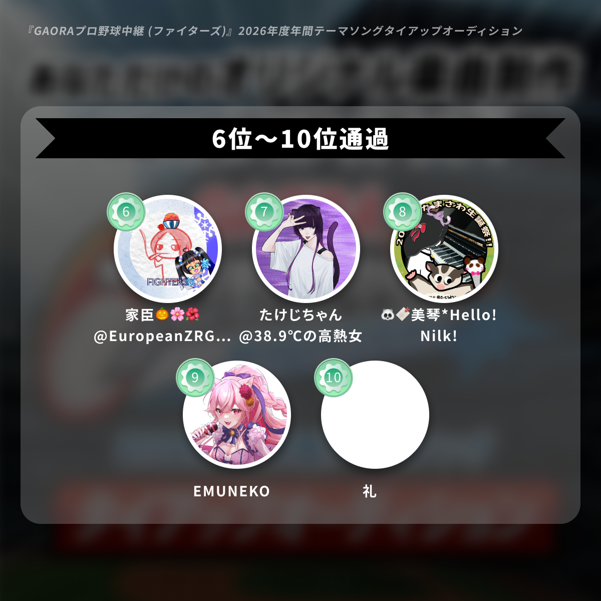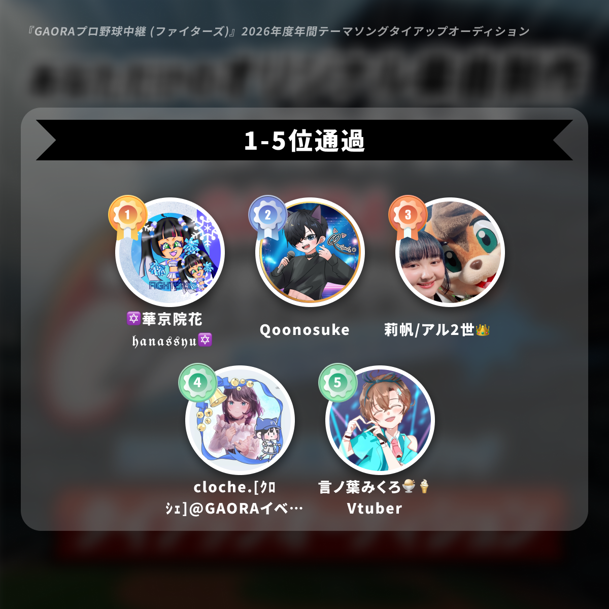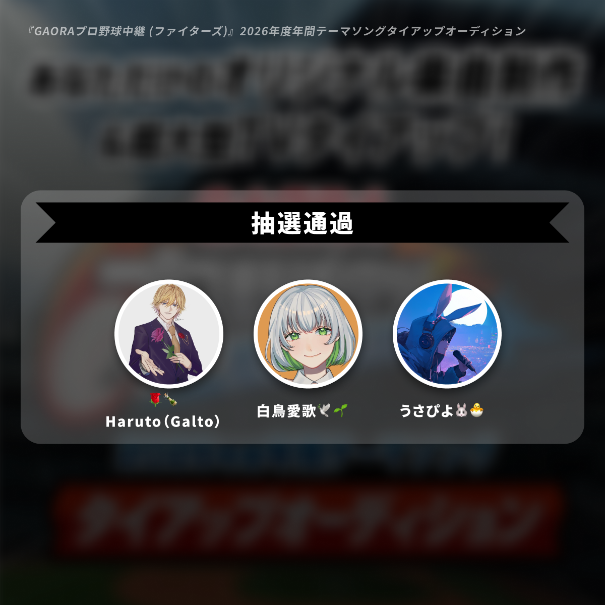 awa December 2, 2025 Android, iOS, PC 『GAORAプロ野球中継(ファイターズ)』2026年度年間テーマソングタイアップオーディション 審査対象者発表 awa Android, iOS, PC 2025.12.02 「『GAORAプロ野球中継(ファイターズ)』2026年度年間テーマソングタイアップオーディション」の開催期間が終了し、グランプリ候補となる審査対象者が決定しました。 以上の13名が審査対象者に決定!審査の結果は12/8(月)中に発表予定です。13名の中からグランプリを勝ち取るのは誰になるのか、お楽しみに! 今後も注目のイベントが目白押し✨各イベントの詳細はこちらからチェック👇