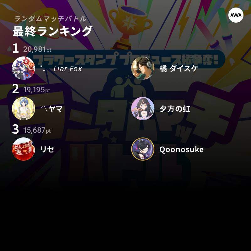 awa September 24, 2025 Android, iOS, PC フラワースタンプ プロデュース権争奪!ランダムマッチバトル 最終結果発表 awa Android, iOS, PC 2025.09.24 「フラワースタンプ プロデュース権争奪!ランダムマッチバトル」の開催期間が終了し、入賞ペアが決定しました。 以上のペアが、それぞれフラワースタンププロデュース権を獲得!おめでとうございます!イベントに参加された配信者の皆さん、応援していたリスナーの皆さん、本当にお疲れ様でした!最終ランキング 今後も注目のイベントが目白押し✨各イベントの詳細はこちらからチェック👇